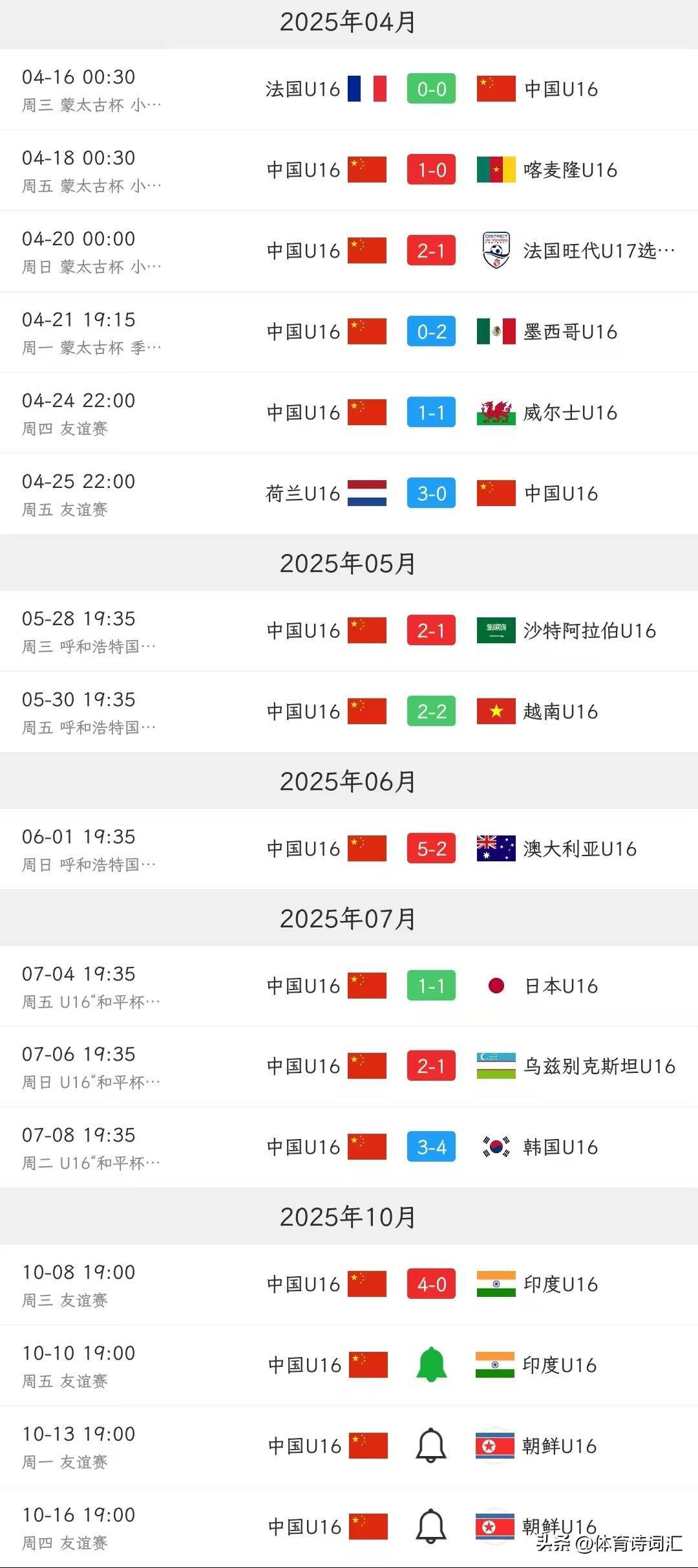 新一代U-16男足在经历上一届因热身赛不足而在年初U-17亚洲杯上遗憾出局的教训后,2025年积极参赛,参加了法国蒙太古杯、沈阳和平杯、荷兰三国杯、呼和浩特四国赛等多项赛事。对手覆盖全球各地,热身对象多为强队,目的是确保尽早晋级明年的U-17亚洲杯,并争取在亚少赛上取得好成绩,力争进入世界少年锦标赛。
