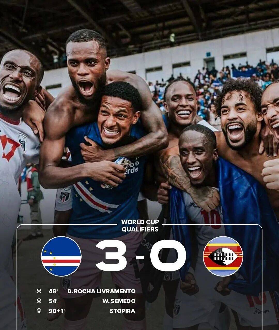 - 比分与进球:佛得角主场3-0击败斯威士兰(Eswatini)。下半场开场不久,Livramento(利夫拉门托)在禁区内捡漏破门打破僵局;随后Will Semedo(威利·塞梅多)凌空再下一城;补时阶段老将后卫Stòpila(斯托皮拉)锁定3-0。