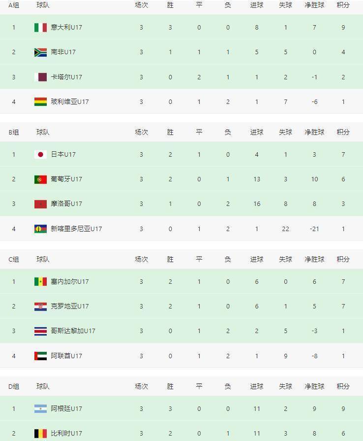 B组的最终积分榜上,日本7分第一,葡萄牙6分第二,摩洛哥3分第三,新喀里多尼亚1分垫底。
