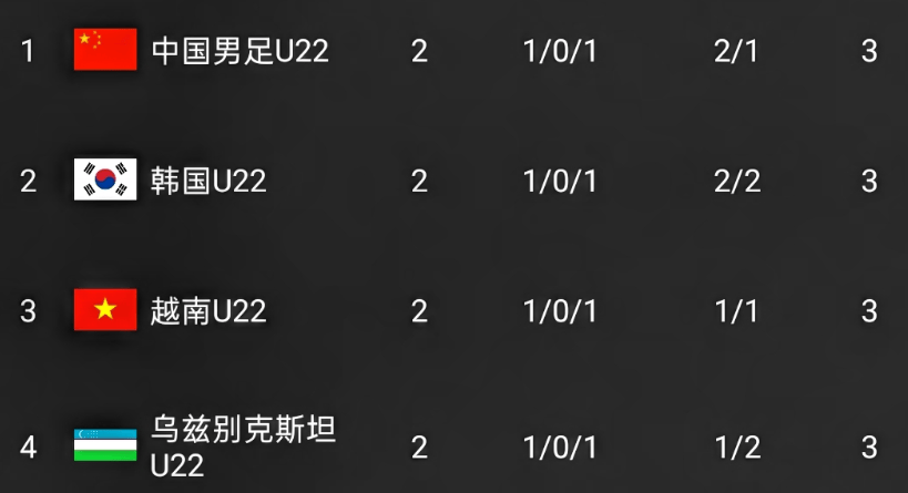 积分榜上比较有意思!前两轮比赛结束,参赛的四支球队都是一胜一负!积3分!中国男足以1个净胜球的优势领跑。排名第二的韩国男足没有净胜球排名第二,而越南男足因为进球数不如韩国男足排名第三。乌兹别克斯坦男足则以负1个净胜球排名垫底。最后一轮比赛,四支球队都有希望夺冠,同时也有可能垫底!所以最后一轮,中国男足肯定是要精心准备的!