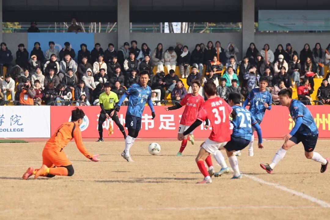 13时15分许,吴兴、南浔、德清、长兴、安吉5支参赛球队以及由裁判员和工作人员组成的队伍在球场上整齐列队,展现出良好精神风貌。看台上,2000余名球迷摇旗呐喊,助威声此起彼伏,现场气氛热烈,驱散了冬日的寒意。