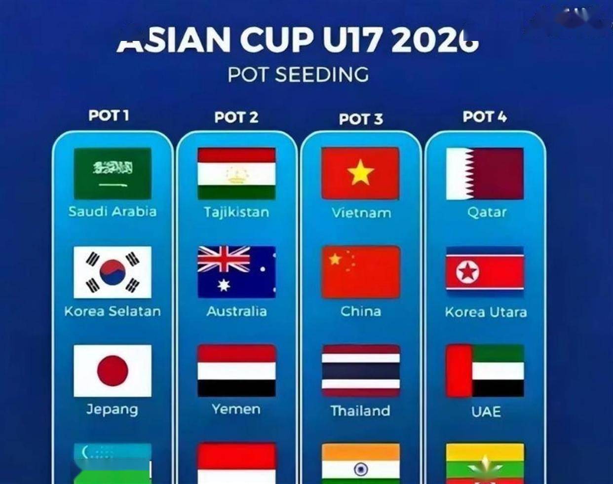 就在印尼之行结束后,另一件关乎球队今年命运的大事将立即上演——U17亚洲杯决赛阶段的分组抽签仪式。这项仪式已经定在2月12日举行。 也就是说,中国队踢完和印尼的第二场热身赛,第二天就要迎来抽签结果。 目前,参加正赛的16支球队分档情况已经全部出炉。 根据过往亚洲杯的成绩,中国队被分在了第三档。 具体分档如下:第一档是日本、韩国、沙特阿拉伯和乌兹别克斯坦;第二档是塔吉克斯坦、澳大利亚、也门和印度尼西亚;第三档是中国、越南、泰国和印度;第四档是卡塔尔、阿联酋、朝鲜和缅甸。